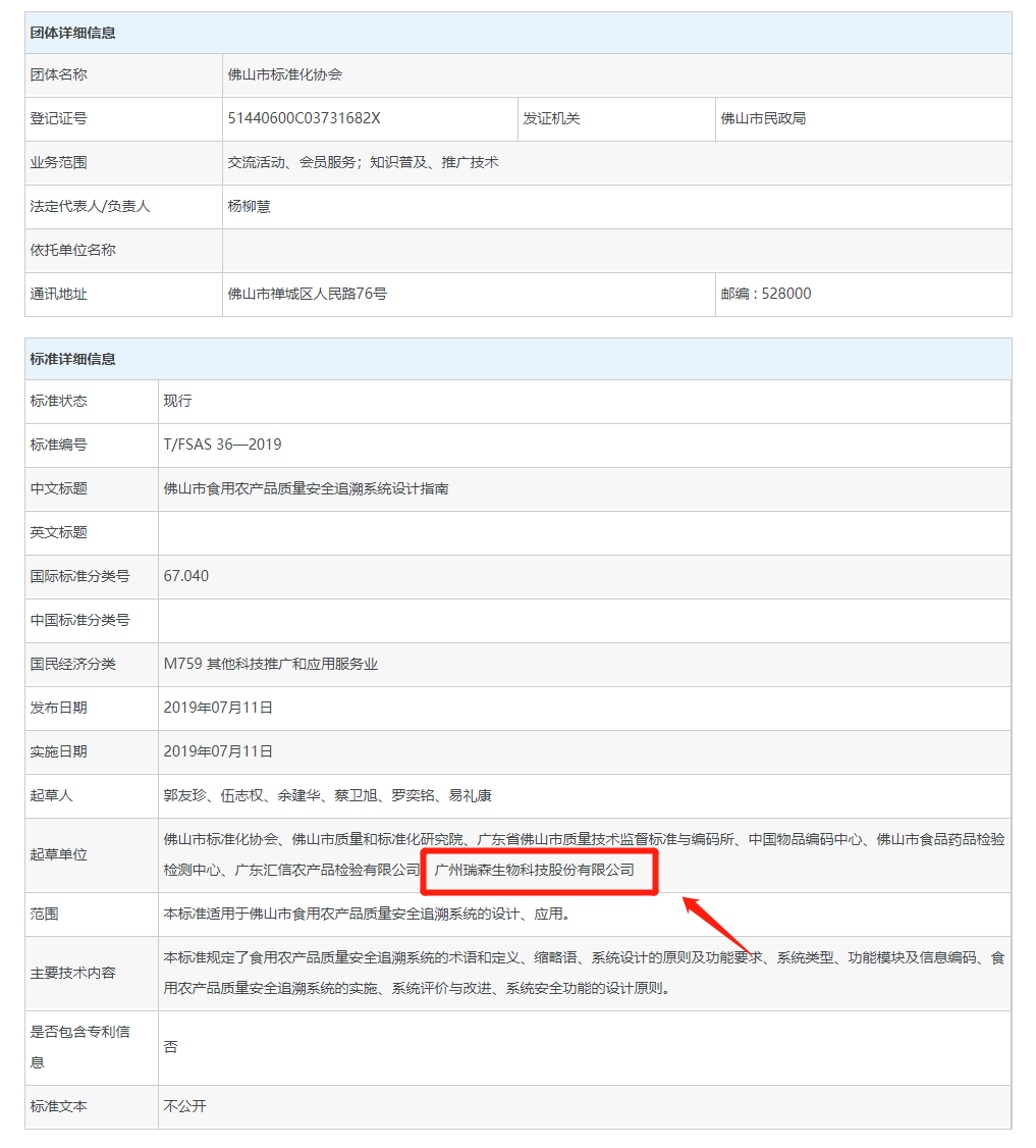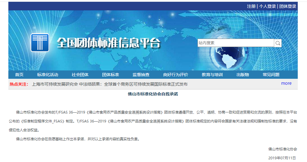 乐动在线平台参与制定的T/FSAS 36—2019 《佛山市食用农产品质量安全追溯系统设计指南》团体标准于2019年7月11日在全国团体标准信息平台发布公示。
