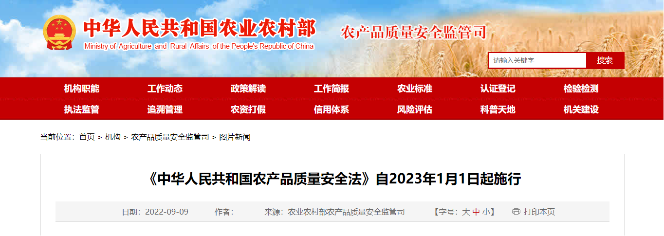 2022年9月2日,全国人大常委会第三十六次会议通过了修订后的《农产品质量安全法》,自2023年1月1日起施行。新版《农产品质量安全法》将进一步加强从农田到餐桌的全过程监管。为全面体现“四个最严”的要求,新修订的农产品质量安全法,在关于农产品质量安全的定义中增加生产经营的农产品达到农产品质量安全标准的内容;在国家建立健全农产品质量安全标准体系的基础上,明确要求“确保严格实施”;在农产品质量安全标准中增加“储存、运输”农产品过程中的质量安全管理要求。